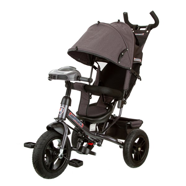 Cовременный и стильный трехколесный детский велосипед TRIKE FA3 с регулируемой спинкой и большими надувными колёсами 12' и 10' , фарой со световыми и звуковыми эффектами, ручкой управления, стояночным тормозом, колясочной крышей, сумкой, багажной корзиной.